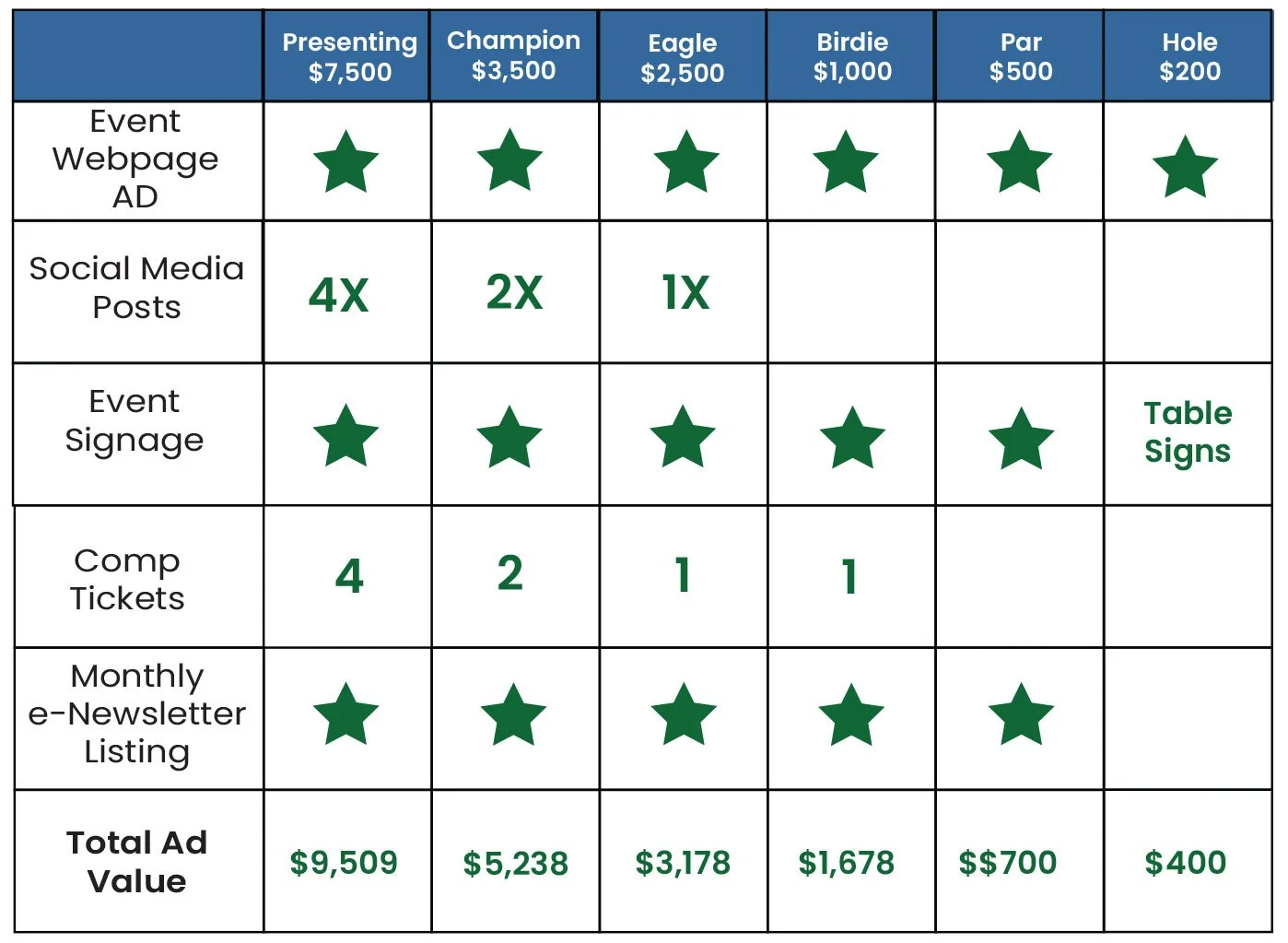 The Lauren Billy Memorial Golf Outing Sponsorship Opportunities The Lauren Billy Memorial Golf Outing Sponsorship Opportunities Clear Filters Filter Clear Filter Presenting Sponsor $7,500.00 Champion Sponsor $3,500.00 Eagle Sponsor $2,500.00 Berdie Sponsor $1,000.00 Par Sponsor $500.00 Hole Sponsor $200.00 No results found No results match your search. Try removing a few filters.